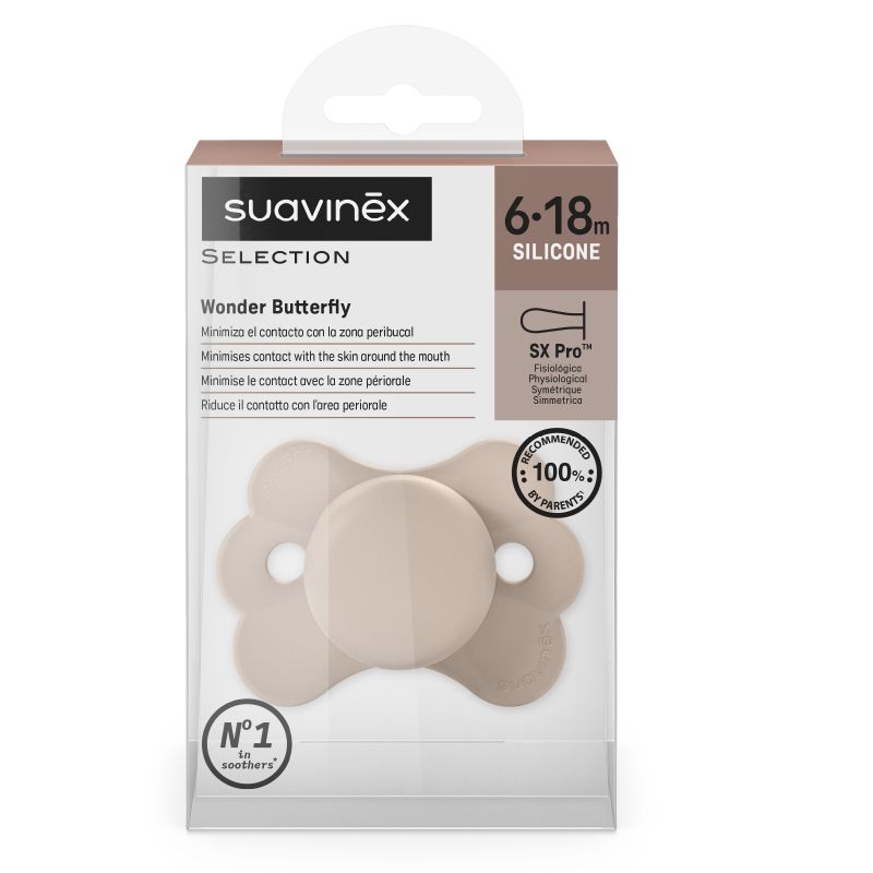 Schnuller der Premiumklasse für Babys im Alter von 6 bis 18 Monaten. Entwickelt mit physiologischem SX Pro Silikonsauger, der sich perfekt an den Mund des Babys anpasst und dabei minimalen Druck auf den Gaumen ausübt.